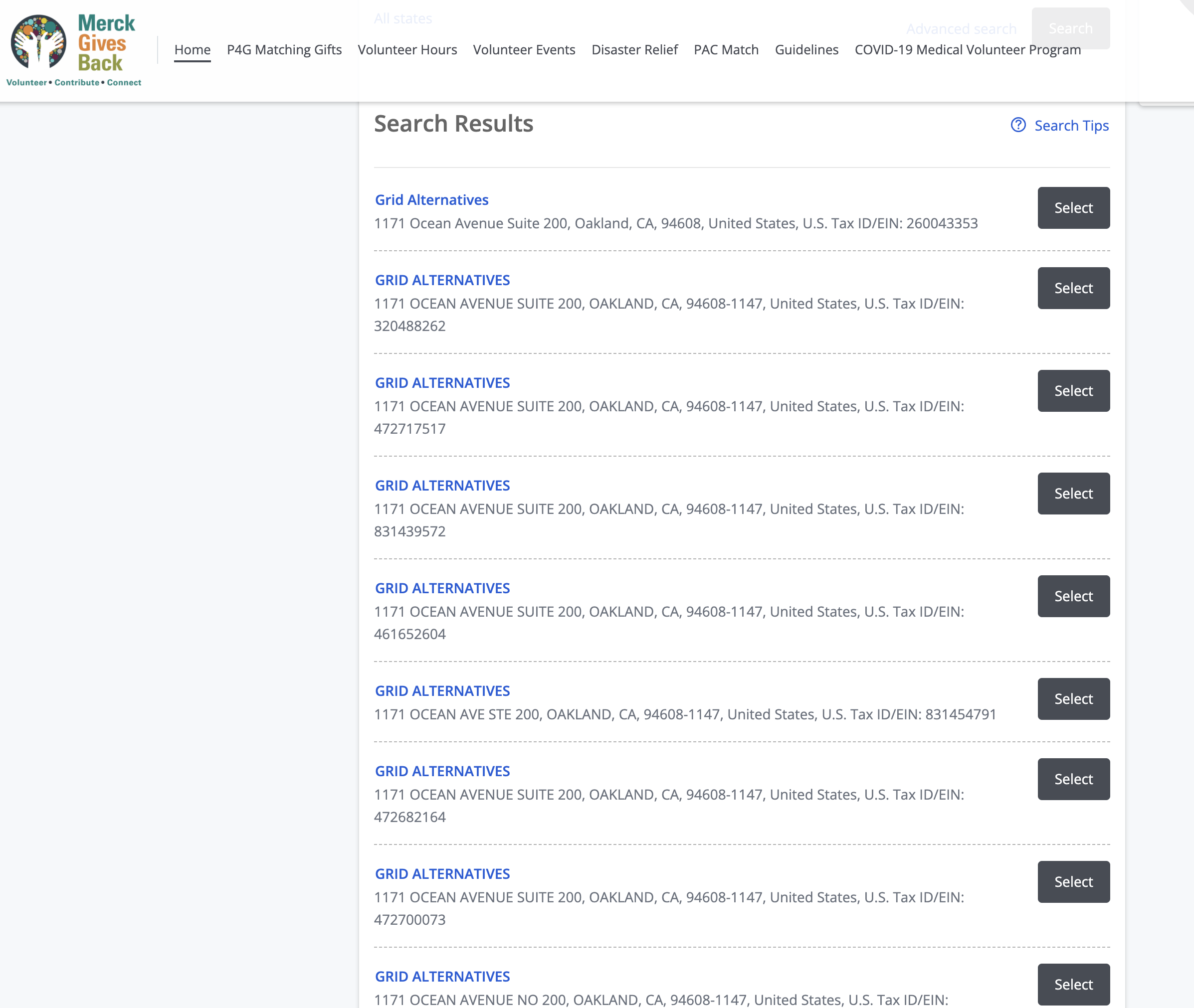 Having a group EIN has allowed my organization to streamline the accounting function by only submitting one tax return, so I understand the value of it from an organizational management standpoint. But it has had some unforeseen consequences for us in fundraising. The problem is that officially in the IRS database, my organization is just listed as "GRID Alternatives" with the headquarters address, and then each affiliate is also listed as "GRID Alternatives" with the headquarters address, but with its unique EIN. Each of the affiliates should be named "GRID Alternatives Colorado, GRID Alternatives Los Angeles, etc" but because of the Group EIN, they aren't. When databases like Donor Advised Funds and workplace giving entities pull their information from the IRS database, what they end up with is 9 listings that look almost identical. (see below)